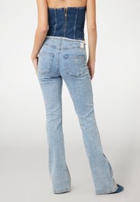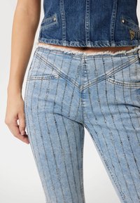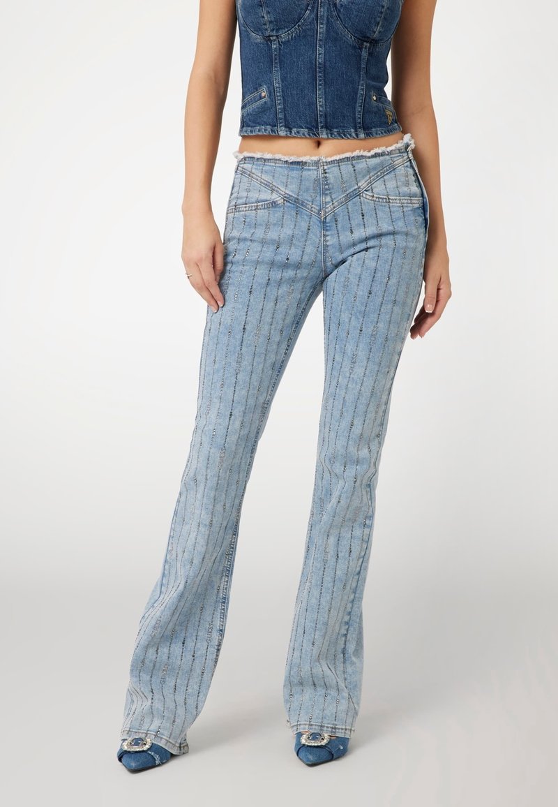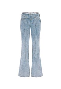 Jean évasé bleu clair avec des motifs de couture verticaux. Le tissu présente une texture denim délavée. Dispose d'une taille mi-haute et de détails complexes.