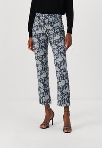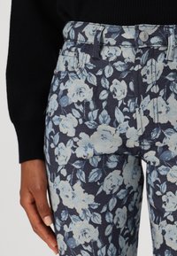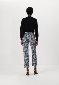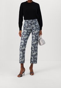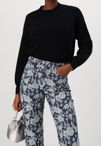 Femme portant un pantalon court bleu marine à motif floral, un haut noir à manches longues et des sandales noires à talons hauts avec des brides autour de la cheville.