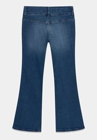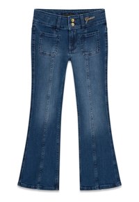 Jean évasé bleu foncé avec poches avant à rabat, fermeture à double bouton, et logo "Guess" doré brodé sur la ceinture.