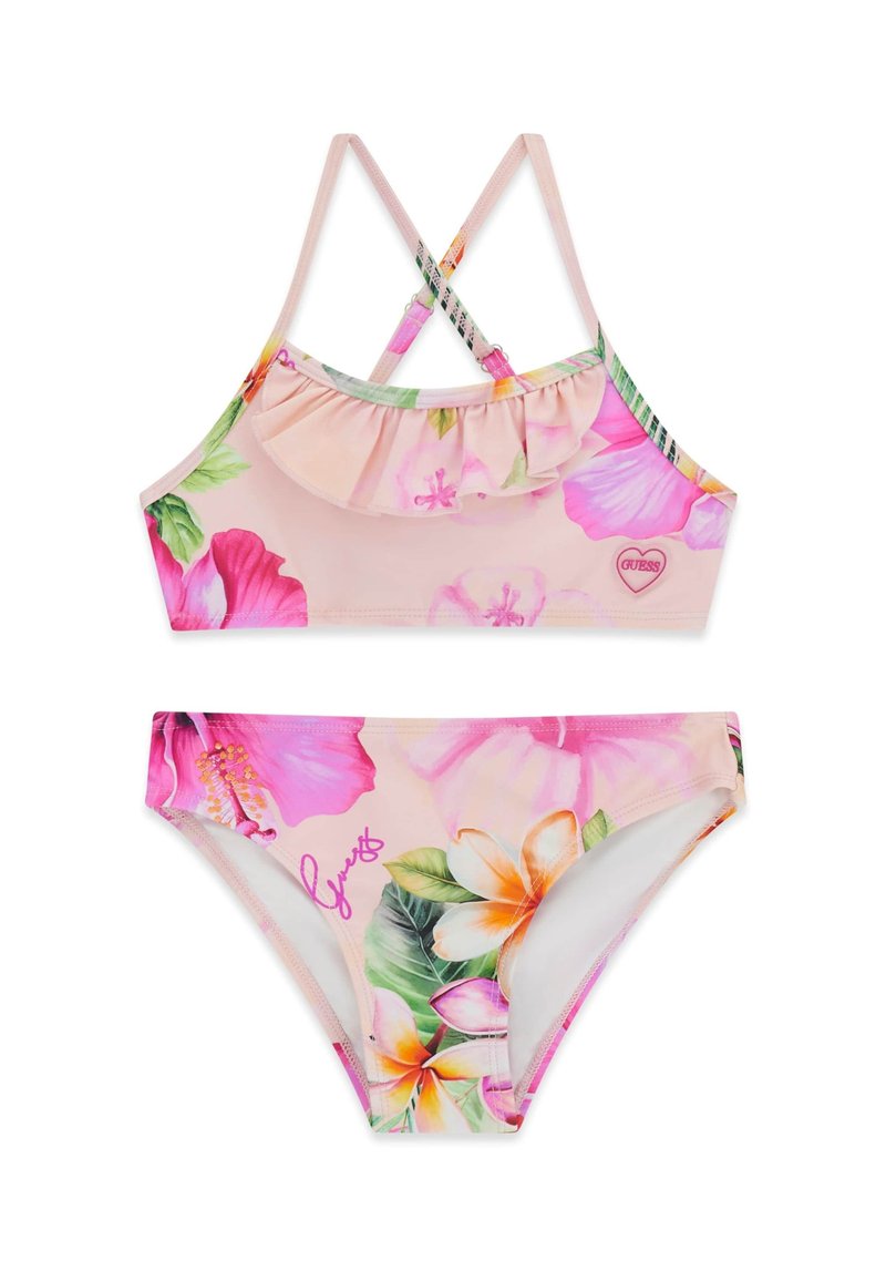 Maillot de bain deux pièces rose à motifs floraux avec haut volanté et bretelles croisées ajustables, orné de fleurs tropicales et de détails avec le logo Guess.