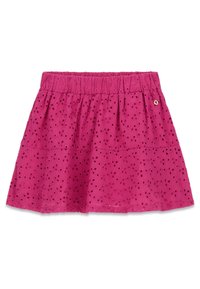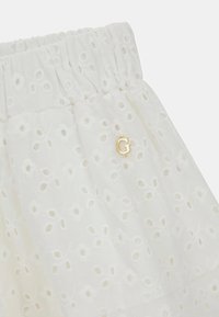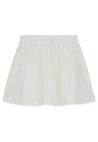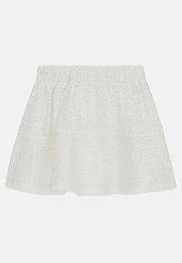 Jupe en coton blanc avec broderie anglaise, taille élastique et petit emblème doré sur le côté supérieur droit.