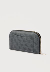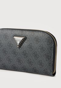 Portefeuille en similicuir noir avec une surface texturée, un logo triangulaire proéminent et une fermeture éclair. Présente des motifs embossés subtils.