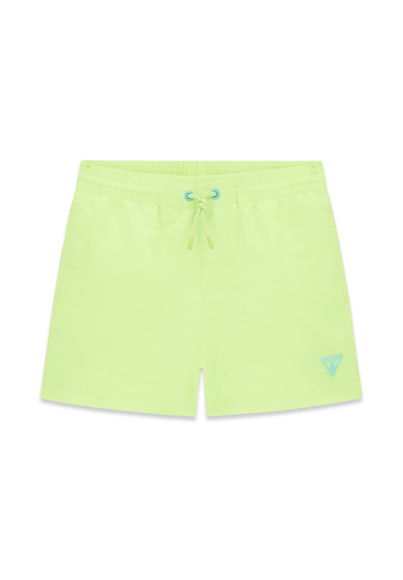 Shorts de bain vert néon avec ceinture élastique, cordon de serrage à l'avant avec œillets bleus, et petit logo bleu sur la jambe gauche.