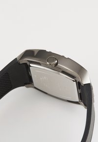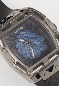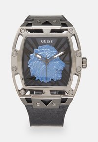 Montre carrée en argent avec bracelet noir, motif tête de lion bleu sur cadran noir, aiguilles argentées, et logo "GUESS" en haut au centre.