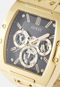 Montre-bracelet Guess en métal doré avec cadran carré noir, trois sous-cadrans pour les fonctions 24 heures, jour et date, et index dorés.
