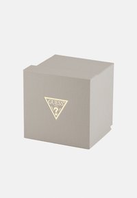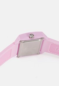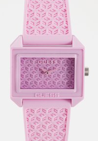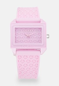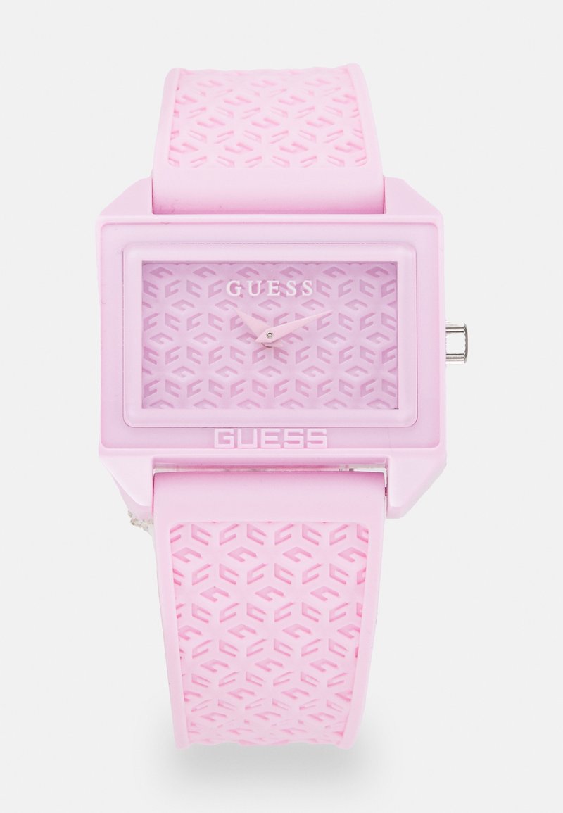 Montre-bracelet Guess rose avec cadran rectangulaire, cadran et bracelet à motifs, couronne argentée et deux aiguilles roses indiquant l'heure.