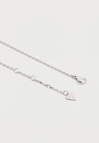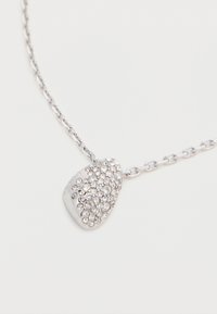 Collier chaîne en argent avec un petit pendentif en forme de goutte orné de cristaux transparents et une fermeture à mousqueton avec une chaîne réglable.