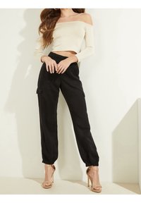 Pantalons cargo noirs avec des poignets élastiques, dotés de deux poches avant et de poches cargo sur les côtés, fabriqués dans un tissu lisse. Associés à des talons beiges.