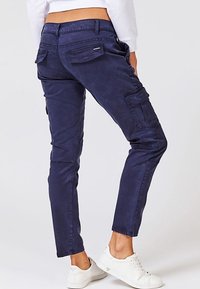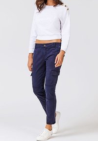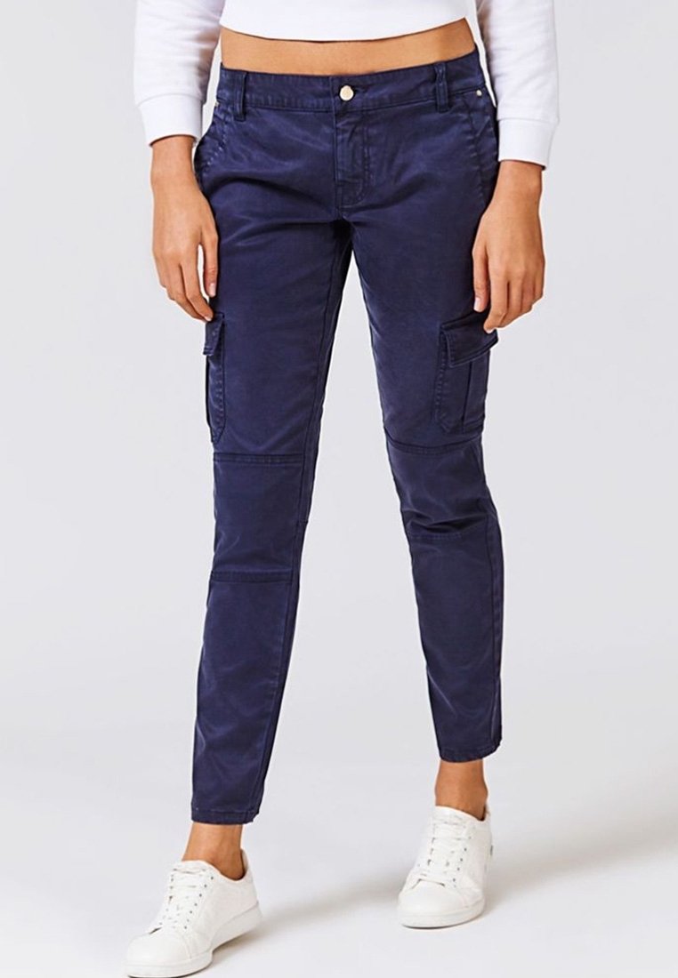 Personne portant un pantalon cargo bleu marine et des baskets blanches, se tenant les mains détendues sur les côtés sur un fond neutre.