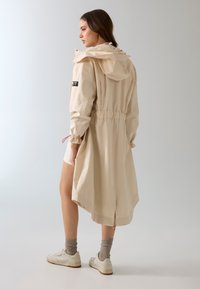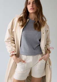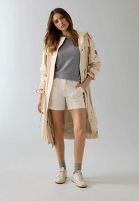 Femme ajustant la manche d'un long trench-coat beige, portant une chemise grise, un short blanc, des chaussettes grises et des baskets blanches, debout devant un fond uni.