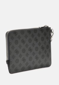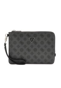 Portefeuille en cuir noir avec une surface texturée, présentant un motif répétitif, une fermeture zippée et une sangle de poignet amovible. Accent en logo argenté.