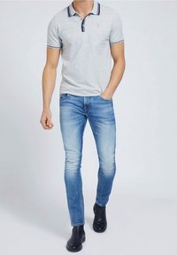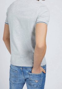 Polo gris avec patte de boutonnage à deux boutons, col rayé bleu marine et poignets de manches, avec un petit écusson logo sur la poitrine gauche.