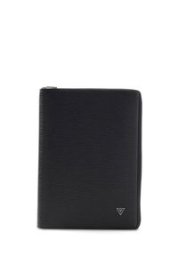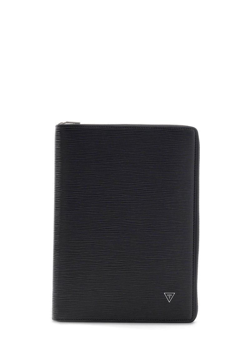 Portefeuille zippé en cuir texturé noir avec petit logo triangulaire Guess dans le coin inférieur droit.