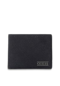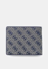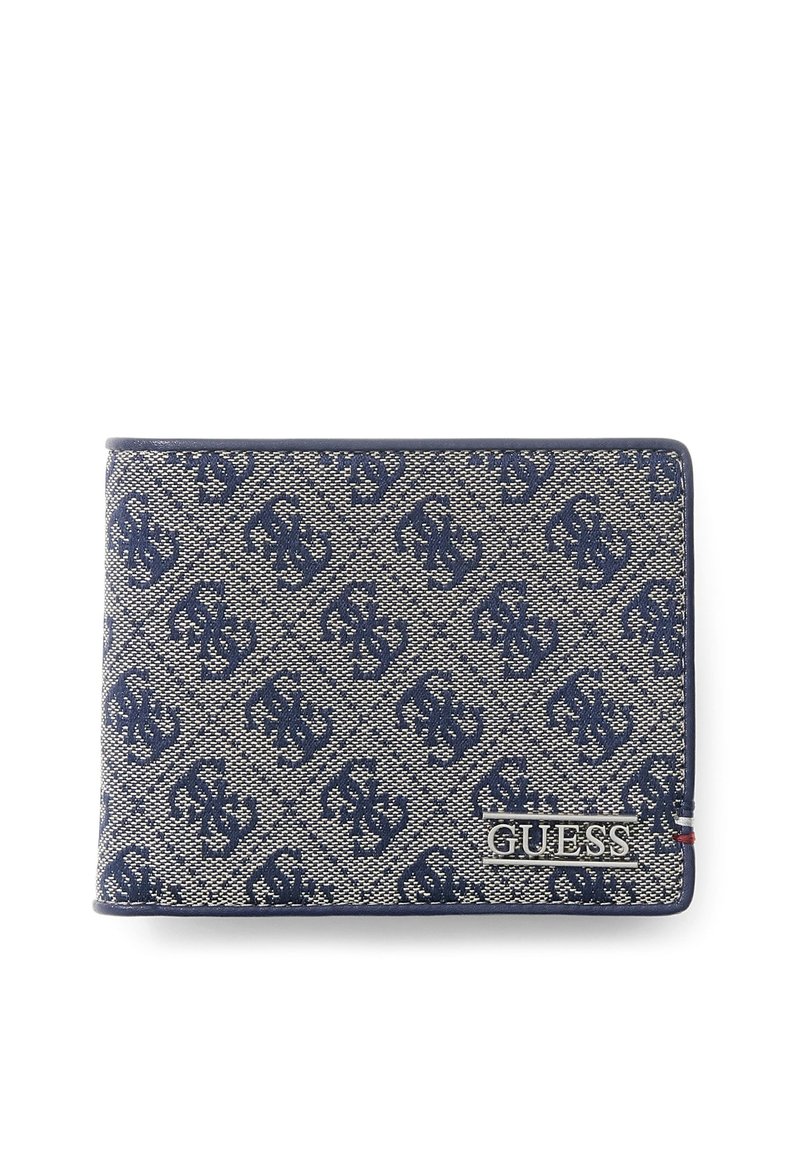 Portefeuille rectangulaire Guess en tissu bleu à motifs, avec un design répétitif du logo, une bordure bleue, et une plaque en métal de la marque Guess dans le coin inférieur droit.