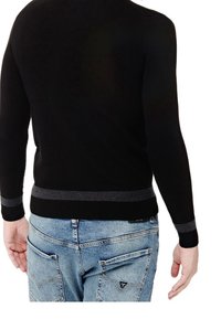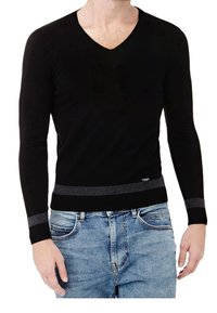 Pull noir à col en V avec manches longues, associé à un jean slim bleu clair. Des baskets noires avec semelles blanches renforcent le look décontracté.