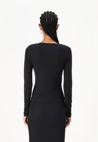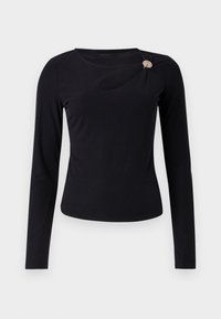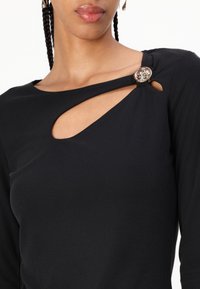 Femme portant un haut noir à manches longues avec une découpe asymétrique au niveau du col, maintenue par une broche argentée.