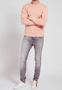 Homme portant un sweat-shirt Guess rose pâle avec poignets et ourlet côtelés, associé à un jean gris délavé, mains jointes devant.
