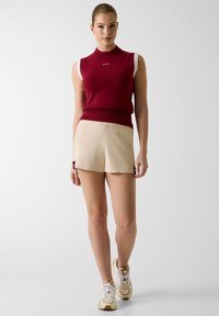 Femme portant un haut sans manches bordeaux avec un liseré blanc et un short beige, sur un fond clair uni, regardant sur le côté.