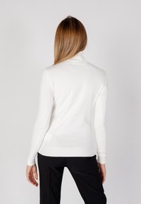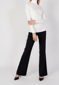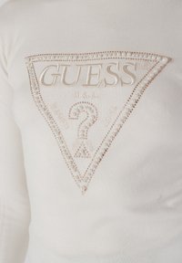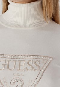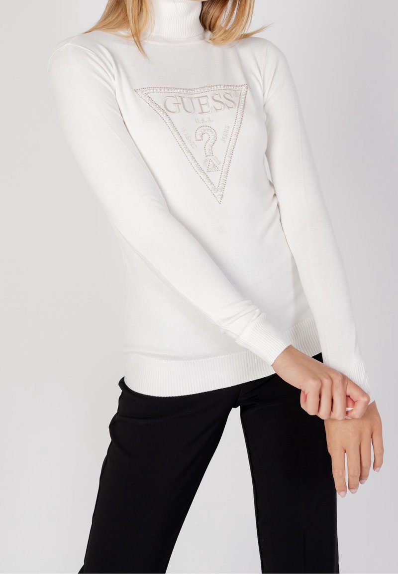 Pull à col roulé blanc avec un grand patch triangulaire brodé, portant les inscriptions "GUESS" et un point d'interrogation. Poignets et ourlet côtelés.