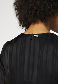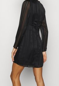 Robe noire avec manches longues transparentes, rayures verticales, col haut et corsage ajusté. Tissu lisse avec une légère brillance.