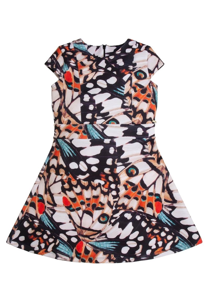 Robe à manches courtes avec jupe évasée, présentant un motif d'ailes de papillon coloré aux tons orange, noir, blanc, sarcelle et beige.