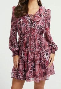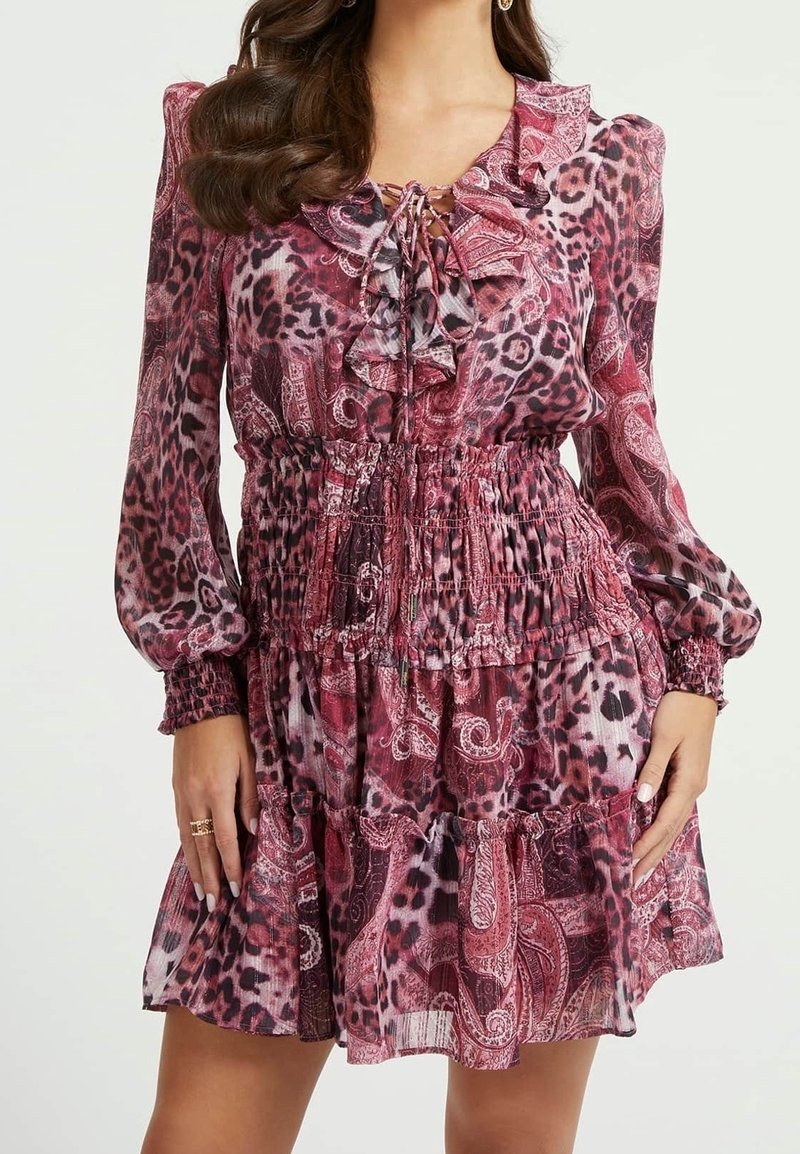 Robe à motif cachemire floral dans des tons de rose et de bordeaux, avec un col à volants, une taille smockée et de longues manches. Tissu léger.
