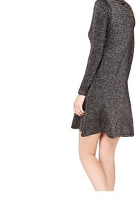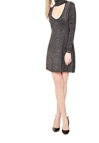 Robe mini noire métallique à la coupe ajustée, manches longues, décolleté plongeant et détails découpés au niveau du col, associée à des talons noirs.