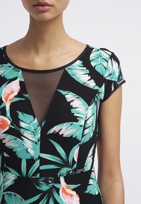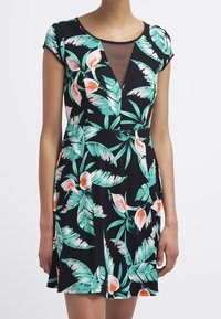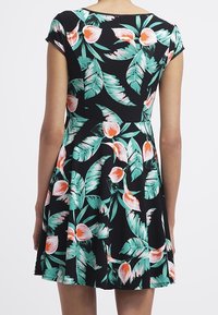 Robe noire à manches courtes, avec un motif floral vert, rose et blanc. Comprend un panneau transparent au niveau du col et une jupe évasée.