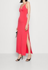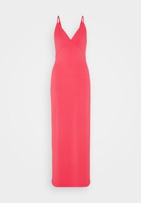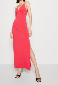 Femme portant une robe corail ajustée, sans manches, longue jusqu'au sol, avec de fines bretelles, et des sandales à talons ouvertes noires, sur un fond uni.
