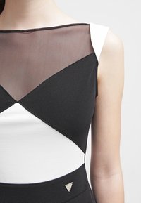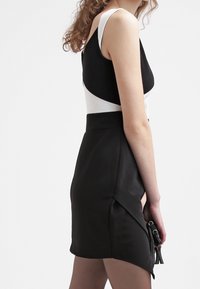 Femme portant une robe noire sans manches avec des panneaux blancs et un décolleté en maille transparente, présentant un ourlet de jupe asymétrique.