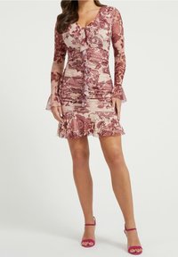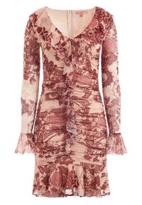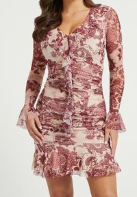 Robe ajustée à manches longues avec un devant à volants, présentant un motif floral dans des tons de bordeaux sur un fond beige clair.