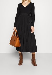 Femme portant une robe midi noire plissée à manches longues avec une ceinture à la taille, associée à des bottines marron à motif crocodile.