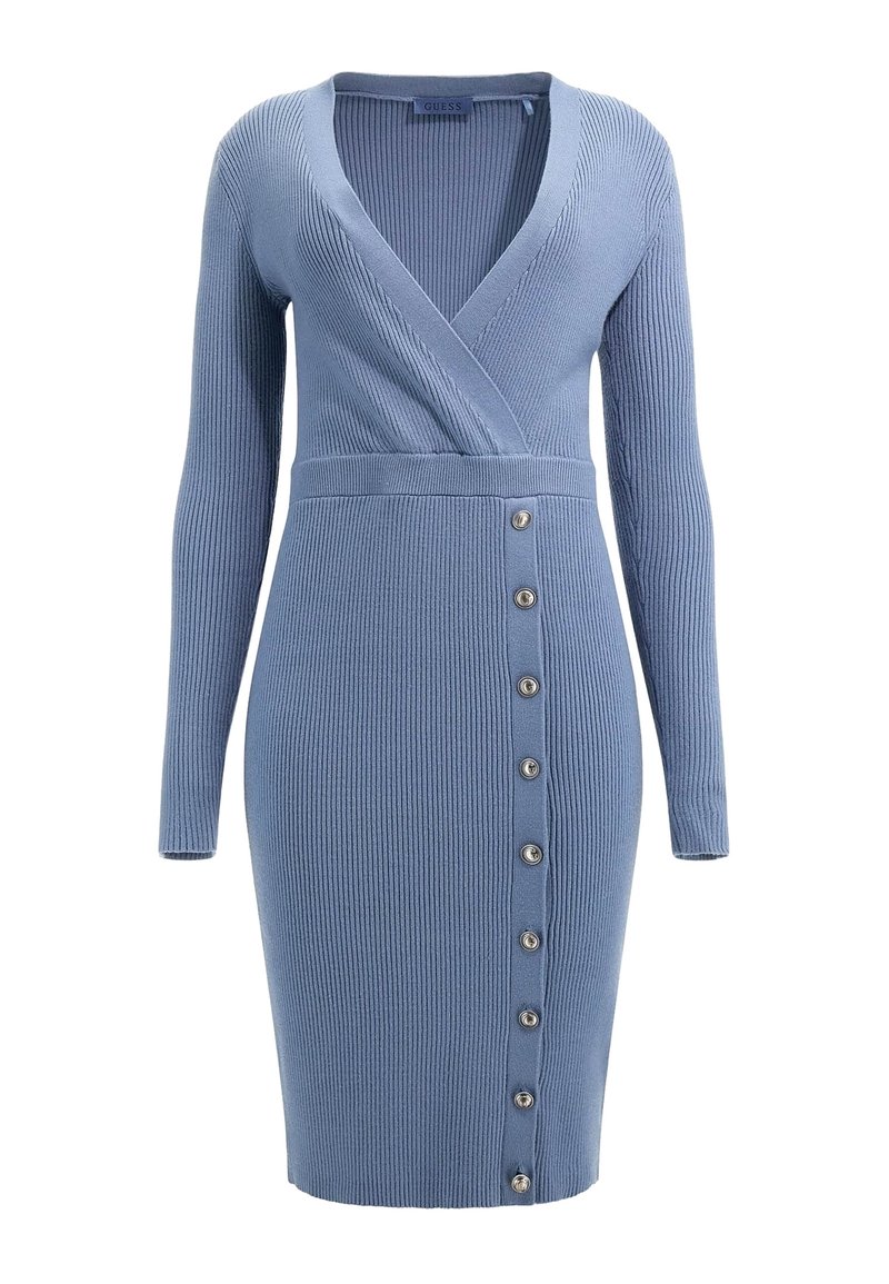 Robe en maille bleu clair avec un col en V, des manches longues, une silhouette ajustée et un détail de boutons le long du côté gauche. Matière côtelée texturée.
