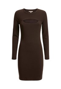Robe marron côtelée à manches longues, avec une découpe en trou de serrure sur la poitrine. Silhouette moulante s'étendant jusqu'au milieu de la cuisse.