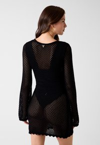 Femme aux cheveux longs et bruns portant une robe en crochet noire à manches longues, avec un détail en forme d'anneau au niveau de l'encolure et un ourlet festonné.