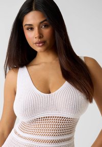 Femme aux longs cheveux noirs portant une robe blanche sans manches en crochet par-dessus des sous-vêtements blancs et des talons ouverts dorés, debout les mains sur les hanches.