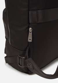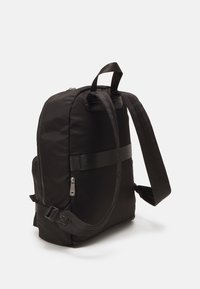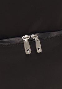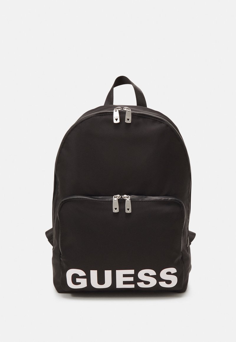 Sac à dos en nylon noir avec bretelles réglables, doubles fermetures éclair, poche avant et grand logo "GUESS" blanc sur le panneau avant.