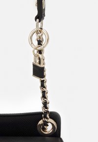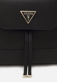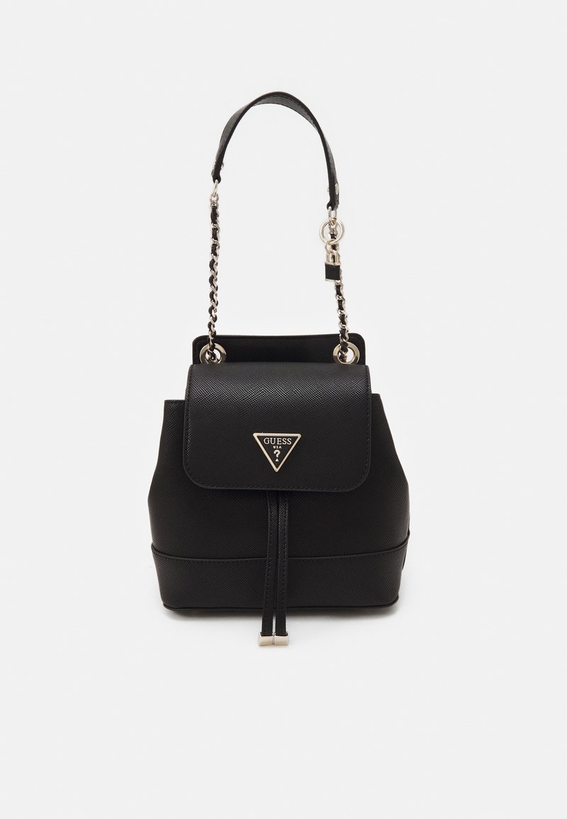 Sac seau noir de la marque Guess avec fermeture à rabat, chaîne et bandoulière en cuir, et logo triangulaire en métal à l'avant.