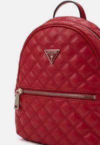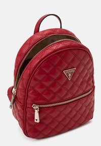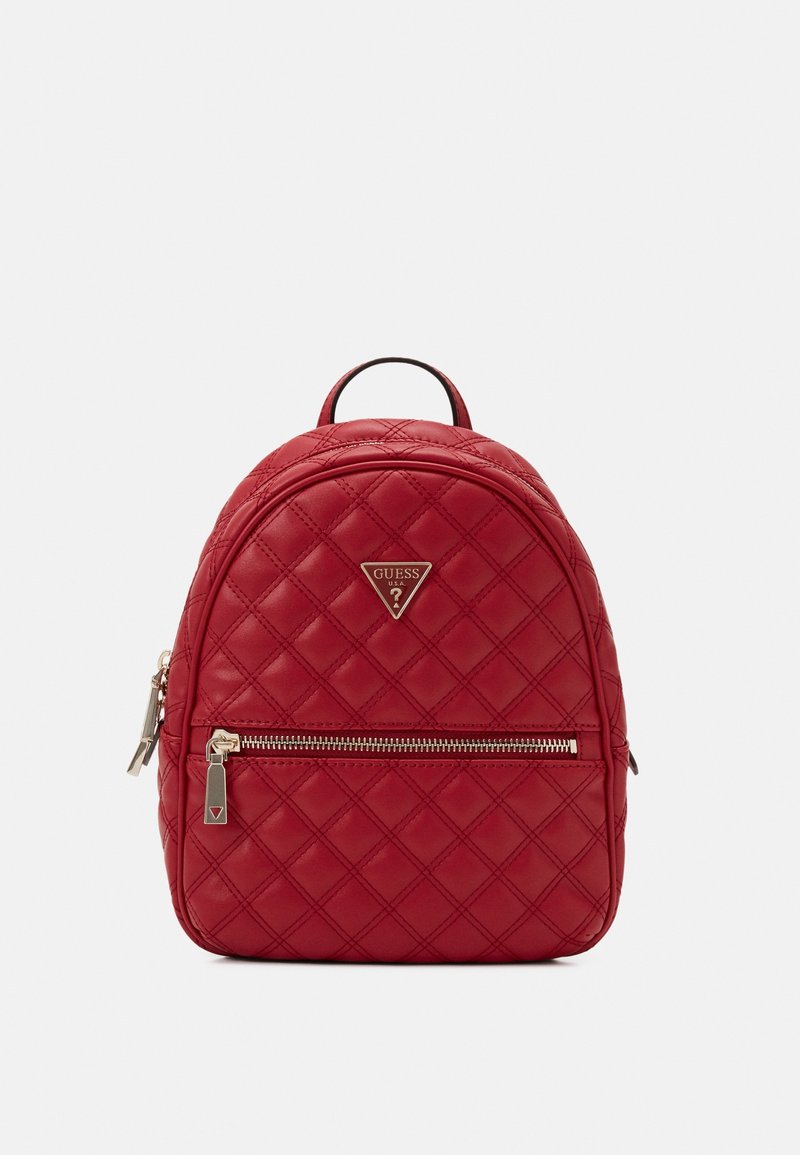 Sac à dos en cuir rouge matelassé avec poche zippée avant, poignée supérieure et plaque logo métallique sur fond uni.
