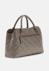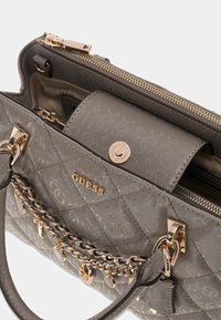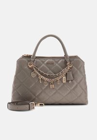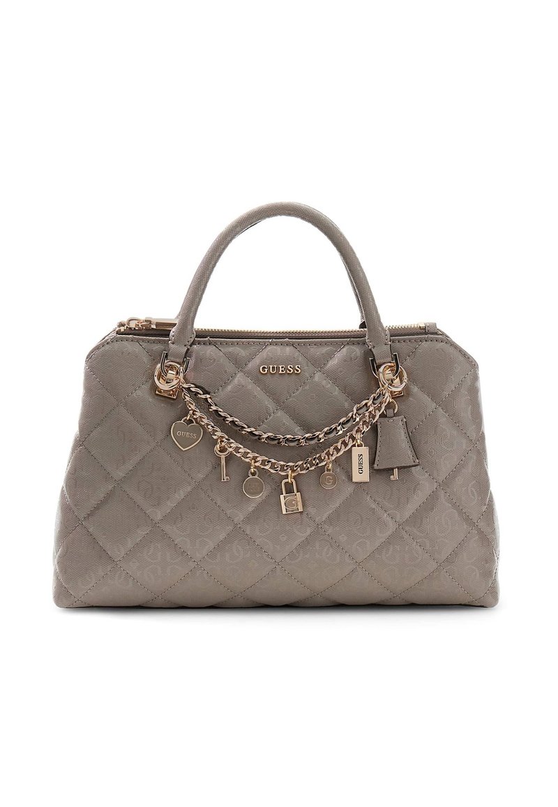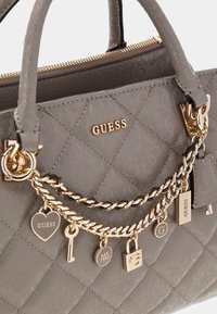 Sac à main matelassé taupe de la marque Guess avec deux poignées, une chaîne dorée et des breloques comprenant un cadenas, une clé, un cœur et des étiquettes avec le logo.