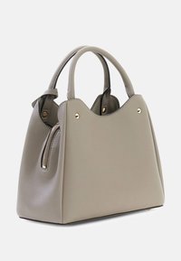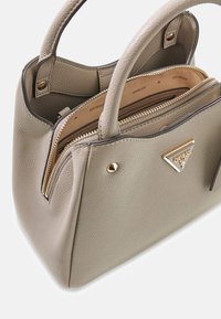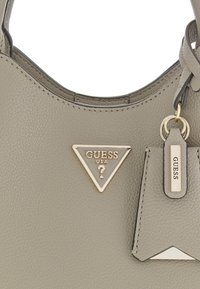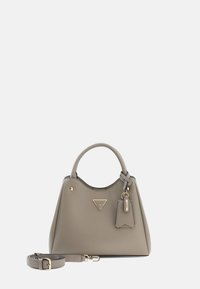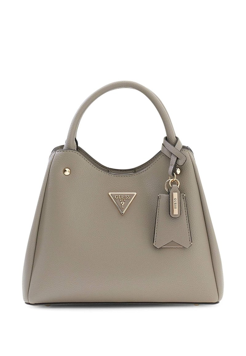 Sac à main en cuir gris de la marque Guess avec anses supérieures arrondies, plaque de logo triangulaire et porte-clés attaché portant le nom de la marque.