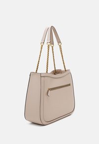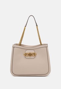 Sac à main en cuir beige avec une bandoulière chaîne, texture lisse, dessus arrondi, garnitures dorées et logo détaillé à l'avant.