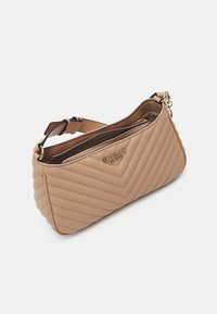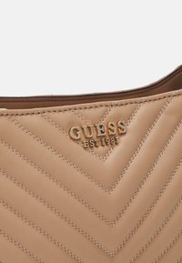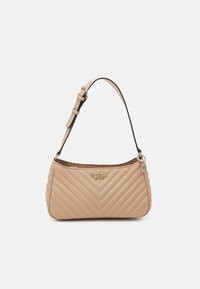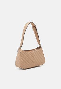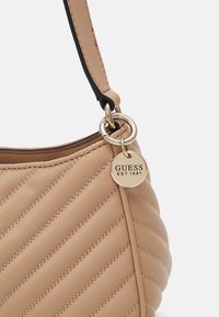 Sac bandoulière matelassé beige avec un logo doré, une sangle ajustable et des accents noirs, présentant une texture lisse et un motif chevron.