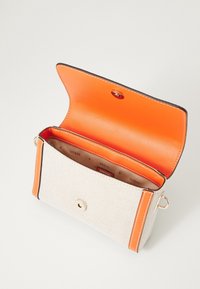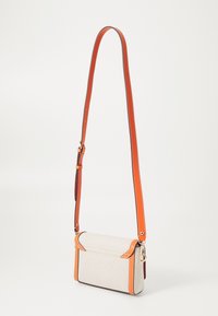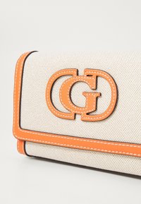 Petit sac bandoulière beige avec bordure en cuir orange, logo double G sur le devant, et sangle réglable en cuir orange avec quincaillerie dorée.