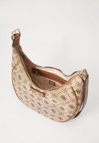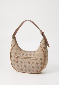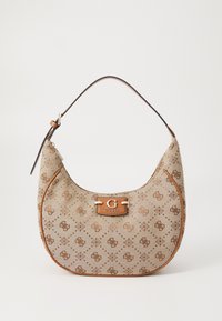 Femme portant un jean court de couleur claire et des talons hauts noirs, tenant un sac à main Guess beige à motifs par la lanière.