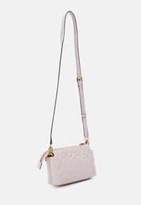 Sac bandoulière en cuir blanc avec une sangle chaîne dorée, des fermoirs tourniquets dorés et l'inscription "GUESS EST 1981" embossée sur le devant.