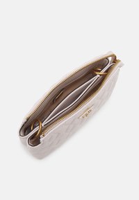 Sac à main Guess blanc et beige avec poche à rabat frontale, accents de chaîne en or, et large bandoulière beige sur un fond uni.