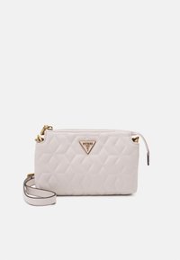 Pochette Guess couleur taupe avec motif de logo en relief, emblème doré en forme de "G" et fermeture éclair sur fond uni.
