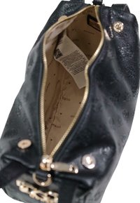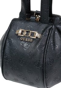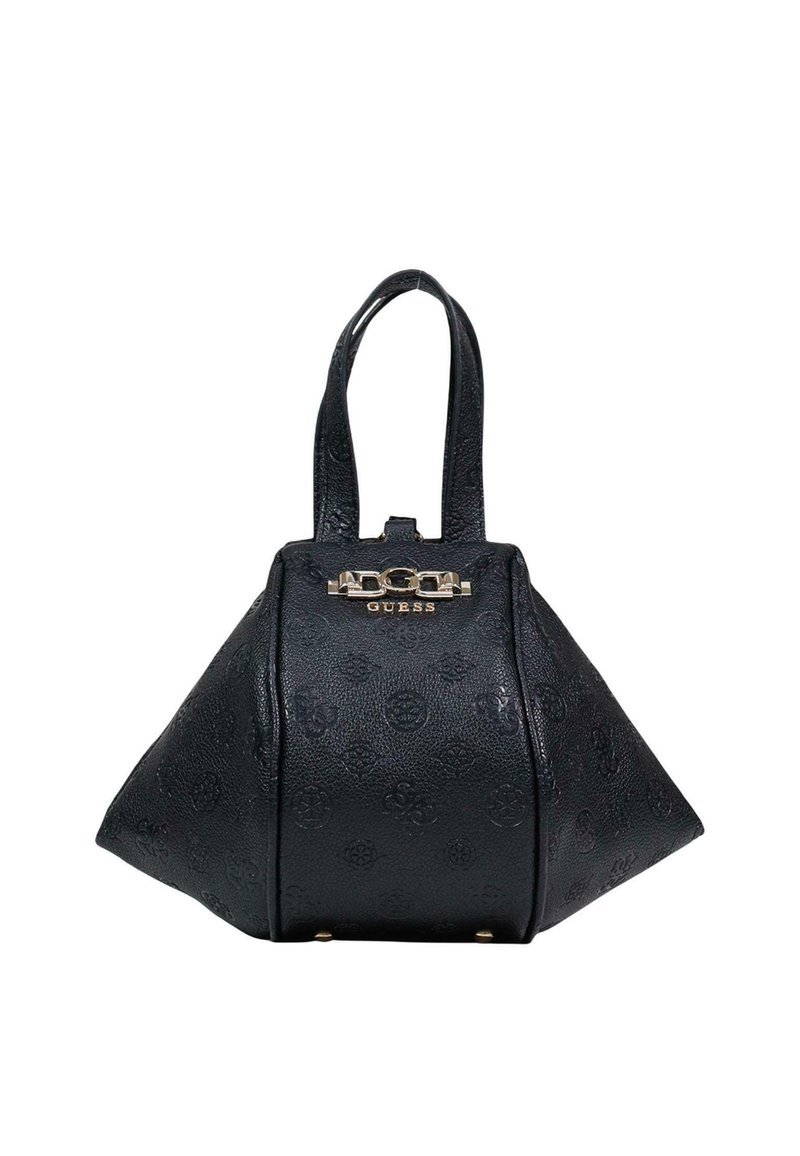 Sac à main Guess en cuir noir texturé avec une forme trapézoïdale unique, double poignées et un logo en métal doré sur le devant.