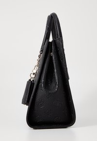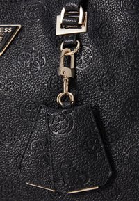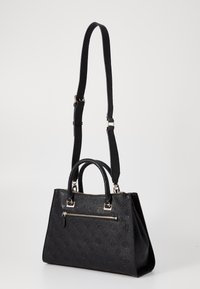 Sac à main noir en matière synthétique texturée. Dispose de deux poignées supérieures, d'une bandoulière réglable, de ferrures ton or et d'accents de logo.